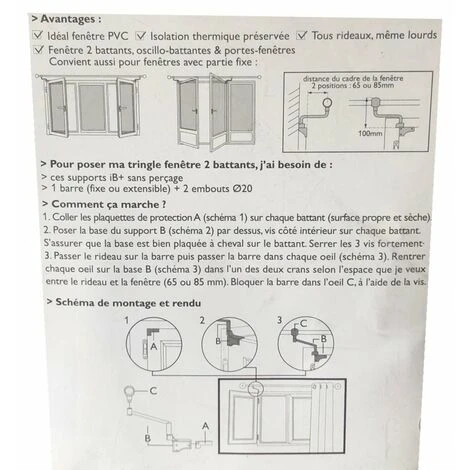 Spécial fenêtre PVC, sans perçage, pose ultra rapide, convient aux fenêtres à doubles battants, même oscillo-battantes et porte fenêtres, isolation thermique préservée, pour tous types de rideaux, même lourds. Le support IB+ est un système breveté qui s’adapte sur fenêtre PVC, et permet de poser une tringle à rideaux sans aucun perçage ! Méfiez-vous des imitations ! Caractéristiques : Diamètre de tringle : de 25 mm à 28 mm