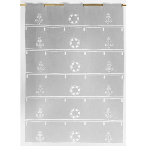 Ambiance « Marine » avec ce brise bise modulable droit en étamine qui est brodé d’ancres marine et de bouées de sauvetage ce qui vous permettra de donner un esprit bord de mer à votre intérieur. Son sytème d’attache se fera par « boutonnières « brodées ou il ne vous restera plus qu’à passer votre tringle. . Lavable en machine à 30°. . Caractéristiques:. Composition : étamine en 100% polyester . Coloris : blanc, gris. Dimensions : 58 x 220 cm. Rapport* : 15 cm. * (La mise au rapport permet d’obtenir un motif qui se répète (ici tous les 15 cm) sans délimitation, sans rupture ni soudure.). . Vendu à l’unité. Prêt à poser