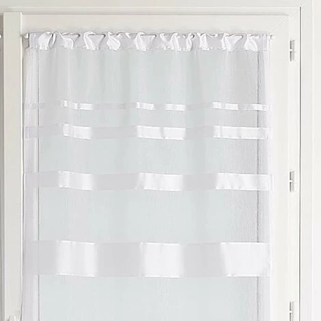 Sobre et raffiné ce vitrage de 90 x 210 cm. . De larges rayures horizontales viennent ajouter une touche de fantaisie à ce voilage. . Sa finition ourlet passe tringle, vous assura une installation simple et rapide. . Les bas et les côtés sont ourlés. . Ce voilage laissera traverser la lumière tout en vous protégeant des regards indiscrets. Lavable en machine à 30°. Vous retrouverez dans cette même gamme, une paire de vitrage. . Caractéristiques :. Dimension : 90 x 210 cm . Finition : ourlet passe tringle. Composition : 100% polyester. Coloris : blanc. . Vendu à l’unité. Prêt à poser