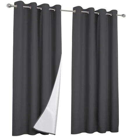 Descriptif du lot de 2 rideaux thermiques gris anthraciteLes rideaux thermiques, tels des rideaux classiques, vous coupent de la lumière pour procurer de l’obscurité dans la pièce. Idéal si vous n’avez pas de volets ou de stores pour passer des nuits paisibles sans être réveillé par la lumière du jour, ou regarder la télévision dans une ambiance feutrée cocooning avec une lumière tamisée douce pour des moments de zénitude ! Derrière leur jolie couleur grise, vous resterez à l’abri des vis-à-vis !En plus d’être élégants, les rideaux sont constitués sur l’envers d’une doublure au revêtement gris foncé qui agit comme barrière thermique en gardant la chaleur de votre intérieur l’hiver et en conservant la fraîcheur de votre pièce l’été. Vous apprécierez leur pouvoir isolant dans la chambre ou le salon par tous les temps, et pourrez moduler la luminosité de votre petit nid douillet à souhait !Le tissu thermique est un excellent isolant empêchant le froid et les courants d’air de rentrer par la fenêtre, porte fenêtre, ou baie vitrée de votre entrée, chambre ou salon, limite les déperditions de température en hiver, et vous permet de réaliser de belles économies d’énergie.Tendance, avec son joli coloris chic et sobre gris anthracite, son toucher doux, et son tombé élégant, le rideau thermique rendra votre pièce de vie moderne et chaleureuse.Prêts à poser, vous n’avez plus qu’à les installer directement sur une tringle avec leur finition 8 œillets ronds argentés ! Rapide et efficace !Avec leurs dimensions classiques 140 x 260 cm, ils s’adaptent à tous les types de fenêtres. Par lot de 2, soyez sûrs d’être protégés de la lumière et des regards !L’épaisseur et la doublure des rideaux double face leur assurent une bonne tenue.Votre pièce à vivre n’en sera que plus cosy et agréable pour des soirées bien au chaud !Dimensions et composition du lot de 2 rideaux thermiques Dimensions : 140 x 260 cmComposition : Polyester 125gr/mCouleur gris anthraciteRideau équipé de 8 oeillets de diamètre 4 cmDécouvrez nos autres rideaux thermiques et stores enrouleurs disponibles sur notre boutique en ligne !