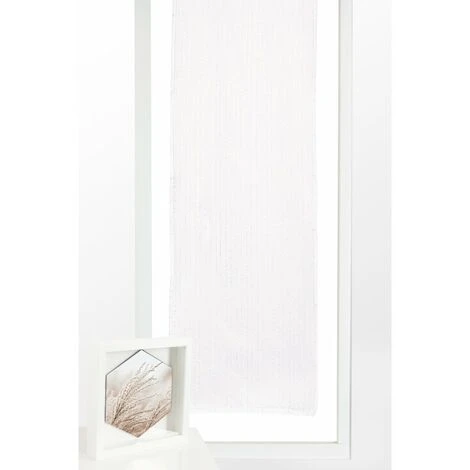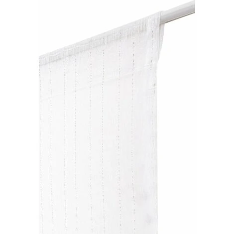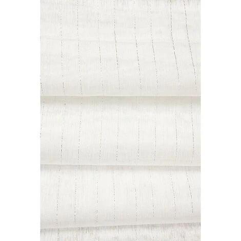 Vitrage avec passe tringle effet lin imprimé de fines rayures verticales et fil lurex argenté blanc. Un vitrage effet lin dont les rayures argentées feront ressortir vos fenêtres.