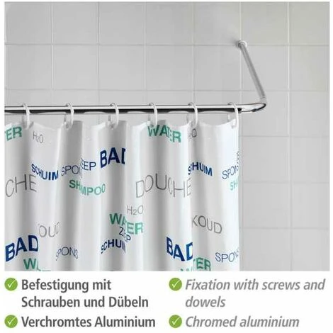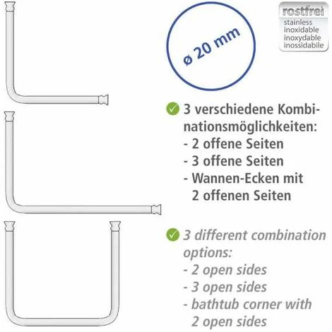 Pratique et d’utilisation universelle, la barre d’angle offre des possibilités de suspension pour les rideaux qui doivent être accrochés aux angles de douche ou de baignoire. Pour cela, elle donne trois possibilités de combinaison de longueurs différentes : Pour les angles de douche avec deux côtés ouverts : 80 x 80 ou 90 x 90 cm Pour les angles de douche avec trois côtés ouverts : 80 x 90 x 80 cm ou 90 x 80 x 90 cm Pour les angles de baignoire avec deux côtés ouverts : 70 x 165 cm Les différents éléments s’emboitent simplement les uns dans les autres et se fixent ensuite au mur à l’aide de vis et de chevilles. Le matériel de fixation est fourni. Fabriquée en aluminium léger à l’aspect chrome, elle a un diamètre de 20 mm adapté aux rideaux de douche et de baignoire courants dans le commerce. La garantie du fabricant est de cinq ans. Pour ce produit, vous bénéficiez d‘une garantie de 5 ans à compter de la date d‘achat. La garantie porte sur tous les vices de matériau et de fabrication qui altèrent le bon fonctionnement. Sont exclus les dommages résultant d‘une utilisation incorrecte ou de l‘usure naturelle. La garantie ne restreint aucun de vos droits à la garantie légaux. En cas de garantie, veuillez renvoyer gratuitement l‘article accompagné du ticket de caisse et convenablement emballé pour le transport à l‘adresse suivante : Wenko-Wenselaar GmbH & Co. KG · Abteilung « Retouren » Im Hülsenfeld 10 · 40721 Hilden, Allemagne [email protected]