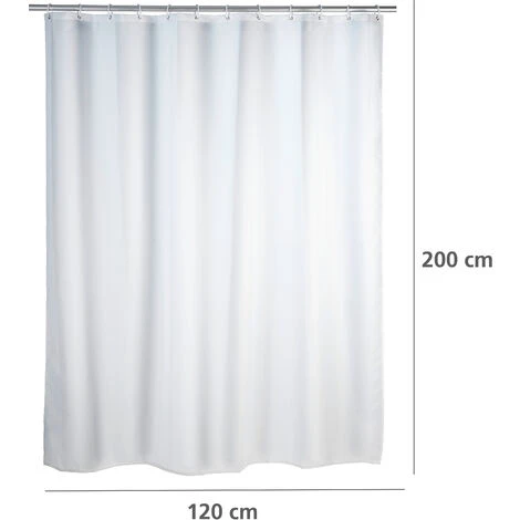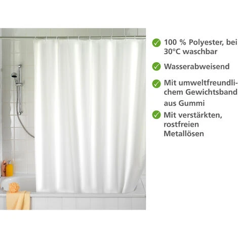 D’une largeur de 120 cm, le rideau de douche blanc est parfaitement adapté aux douches fermées sur trois côtés. Le rideau de douche aux finitions haut de gamme est fabriqué à base d’un tissu polyester particulièrement robuste. La matière est hydrofuge grâce à l’ennoblissement de la surface. Le rideau de douche est facile à entretenir et lavable à 30 °C. L’ourlet supérieur est doté d’un rebord renforcé à trous et d’œillets métalliques inox. Un ruban lesteur à l’extrémité du bas donne au rideau sa forme. La livraison comprend huit anneaux plastiques blancs pour l’accrocher à la barre de douche.l: 200 cm x L: 120 cm